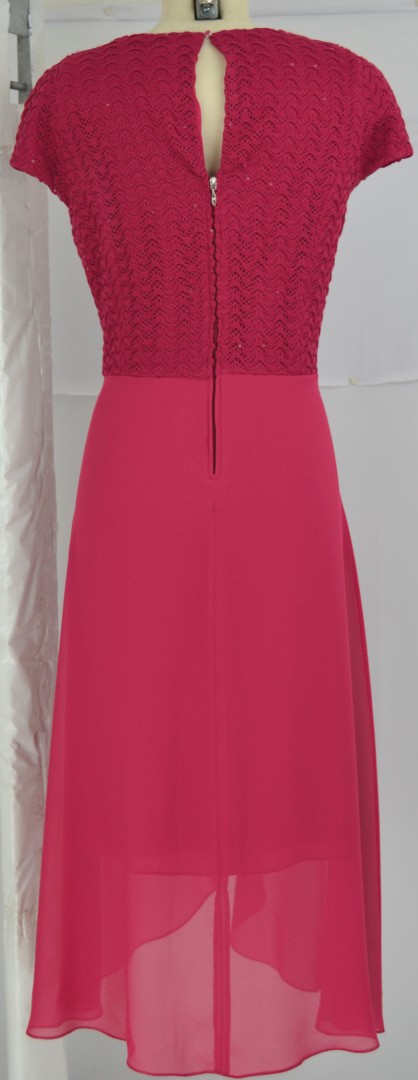 Dieses wunderschöne Kleid in Midi (mittlerer) Länge wurde in granatapfel designt. Der leicht ausschwingende Rockteil mit Überwurf aus feinem Chiffon sowie das Oberteil mit überschnittenem Arm in Häkel-Optik macht das Modell zum Hingucker