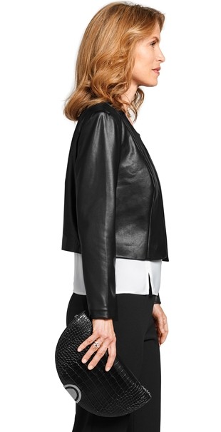 Diese sportiv kurze Jacke mit runden Ausschnitt und dem Verschluss aus Haken und Öse wurde in schwarz aus Kunstleder designt. Diese Jacke lässt sich überaus vielseitig tragen - selbst zum festlichen Anlass über Bluse oder Kleid