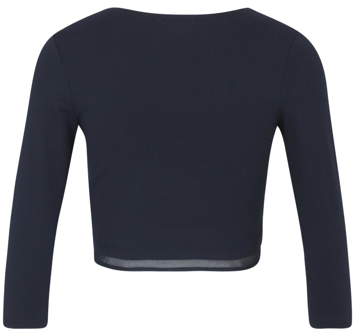 Diese fein gestrickte Jersey Bolero-Jacke wurde als kurze Variante mit dezent transparentem Chiffon Besatz in night sky designt und ist die ideale Ergänzung ohne Verschluss zu Ihrem Outfitt
