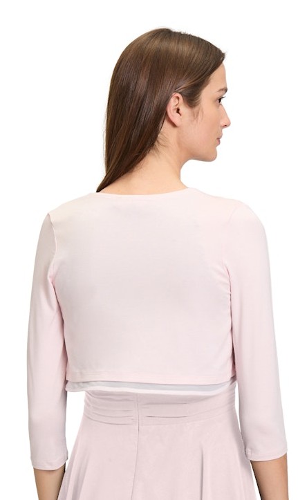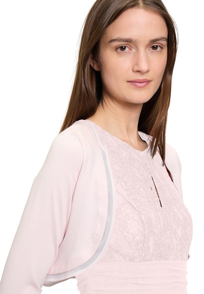 Diese fein gestrickte Jersey Bolero-Jacke wurde als kurze Variante mit dezent transparentem Chiffon Besatz in pal rose designt und ist die ideale Ergänzung ohne Verschluss zu Ihrem Outfitt