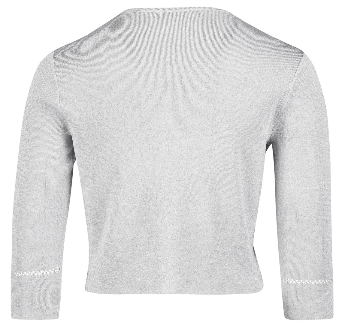Dieses fein gestrickte Strick Bolero mit dezentem Glanz und mit 3/4 Arm wurde als etwas kürzere sowie offene Variante in grey-silver designt und kann sehr vielseitig auch bei besonderen Anlässen kombiniert werden