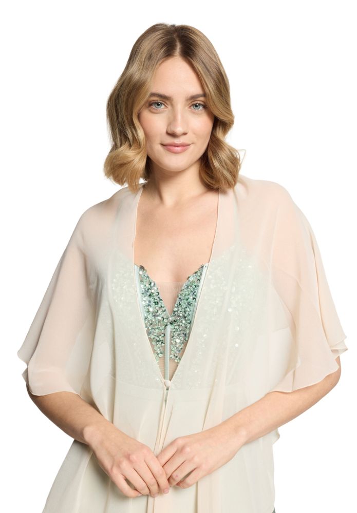 Diese leichte Chiffon Stola kann in whisper pink überaus vielseitig eingesetzt werden und ist immer eine modische Ergänzung auch zu schulterfreien Kleidern. Offen getragen oder als Jäckchen geknöpft ist dieses Accessoires einfach ideal