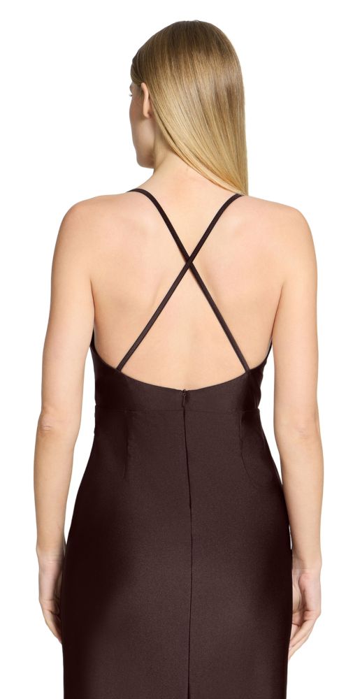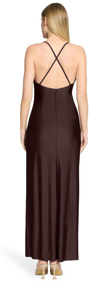 Dieses maxi lange Ballkleid wurde in dark maroon mit dezentem Glanz designt. Der dezente Wasserfallkragen sowie die seitliche Raffung machen das Modell ohne Arm und mit Spaghettiträgern zum echter Hingucker