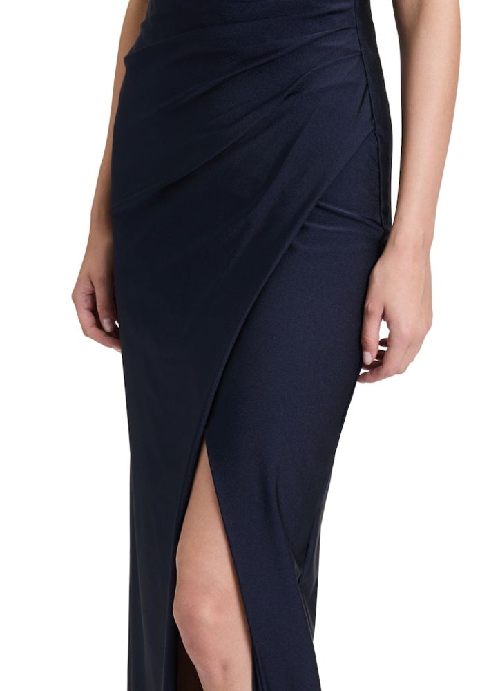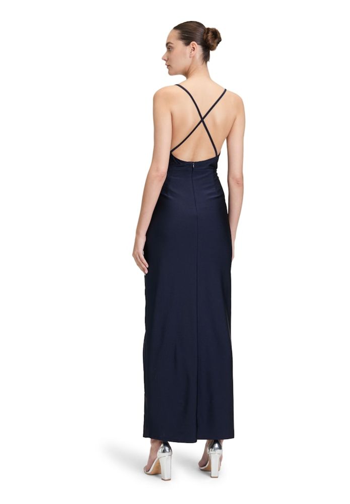 Dieses maxi lange Ballkleid wurde in night sky (marine) mit dezentem Glanz designt. Der dezente Wasserfallkragen sowie die seitliche Raffung machen das Modell ohne Arm und mit Spaghettiträgern zum echter Hingucker