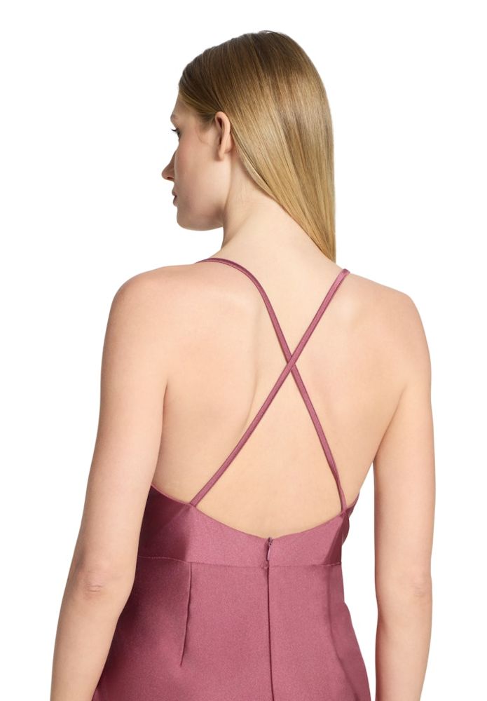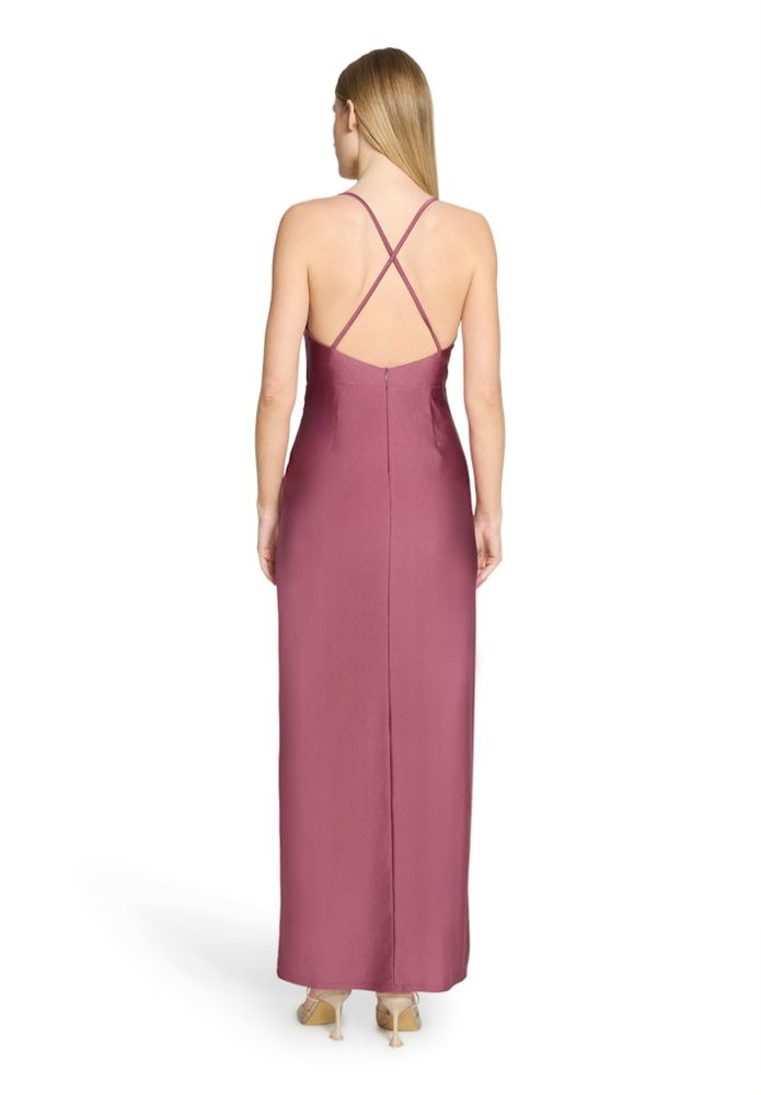 Dieses maxi lange Ballkleid wurde in Sweet Bloom mit dezentem Glanz designt. Der dezente Wasserfallkragen sowie die seitliche Raffung machen das Modell ohne Arm und mit Spaghettiträgern zum echter Hingucker
