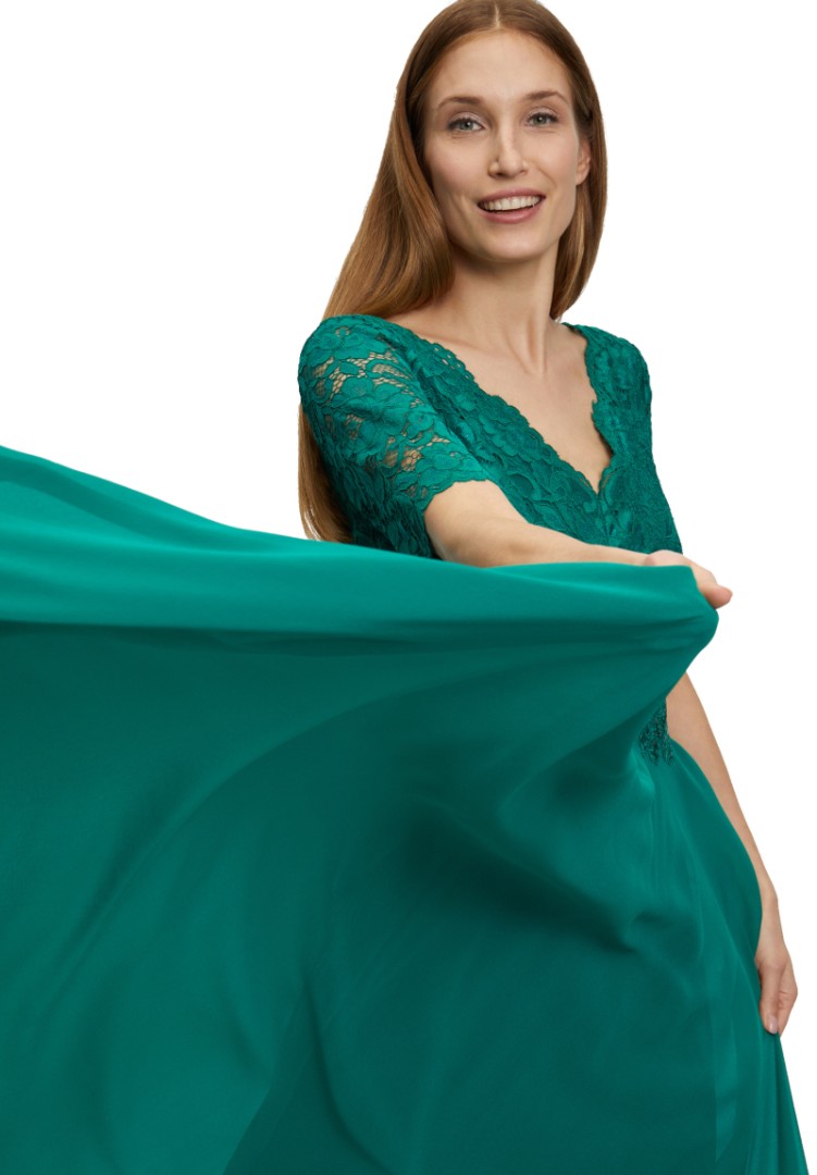 Dieses maxi lange Abendkleid mit 1/2 Arm von Vera Mont ist ein echter Hingucker. Mit viel Spitze am Oberteil sowie V-Ausschnitt und dem schwingenden Rockteil aus feinen Chiffon ist dieses Modell in bright ivy einfach perfekt auch für etwas größere Größen
