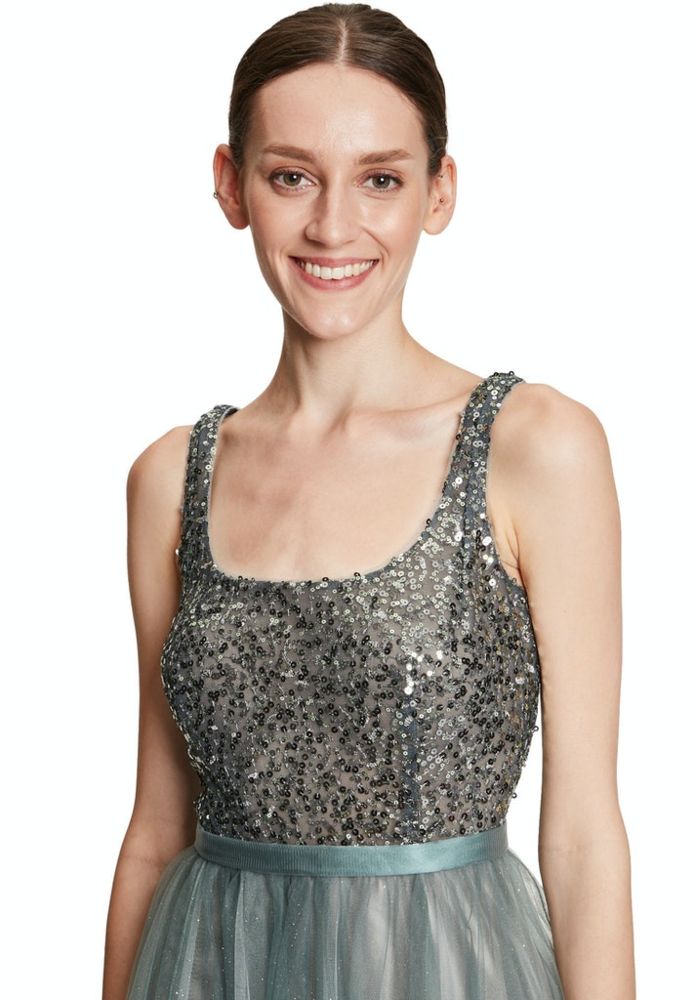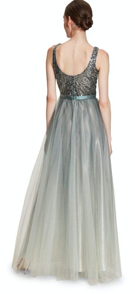 Das feminine lange Abendkleid wurde in green shades designt. Bei diesem Modell wurde das Bustier allover mit feinen Pailletten besetzt. Auch der ausgestellte Rockteil mit viel Tüll und dezentem Glanz verleiht diesem Kleid etwas ganz besonderes