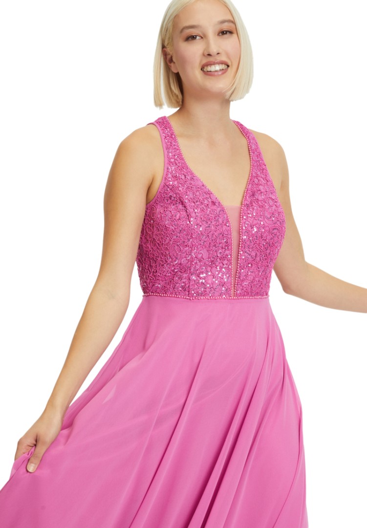 Das romantische maxi lange Kleid in azalea purple ist ein echter Hingucker. Hier wurde der V-Auschnitt mit feinen Perlen verziert sowie mit leicht transparentem Einsatz versehen Auch der leicht ausgestellte Rockteil vermittelt einen ganz besonderen Charme