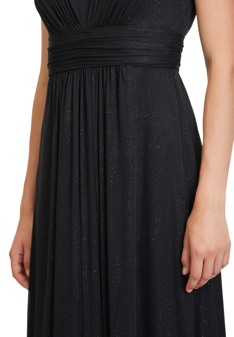 Allover in schwarz mit dezentem Glanz macht dieses maxi lange Modell zum echten Hingucker. Der V-Ausschnitt vorne und Hinten sowie das geraffte Bustier vermittelt hier einen ganz besondere Eleganz