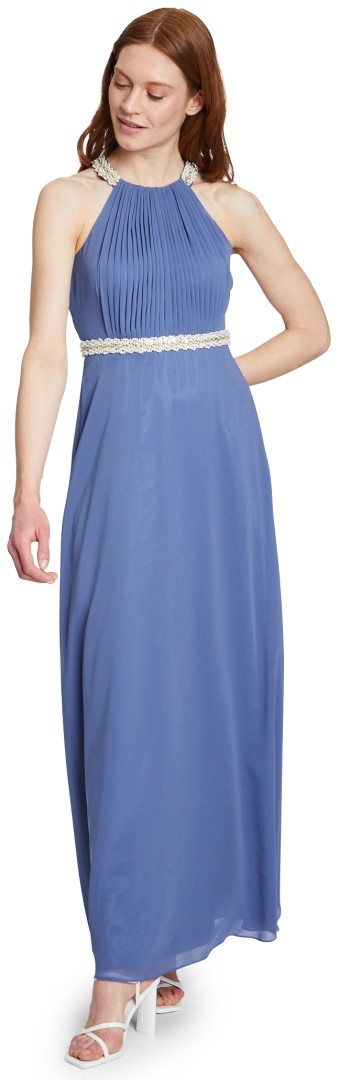 Dieses lange Ballkleid wurde aus feinstem Chiffon gefertigt und besticht durch viele interessante Details. Das in romantische Falten gelegte Bustier sowie die edlen Perlen am Amerikanischen Ausschnitt mit Neckholder und in Taillenhöhe machen dieses figurumspielende Modell auch durch die offene Rückenparti zum echten Hingucker in bleu für Ihren ganz besonderen Auftritt