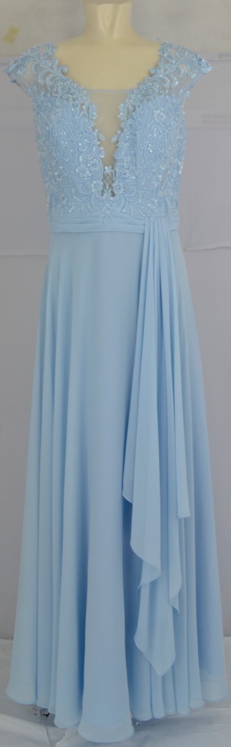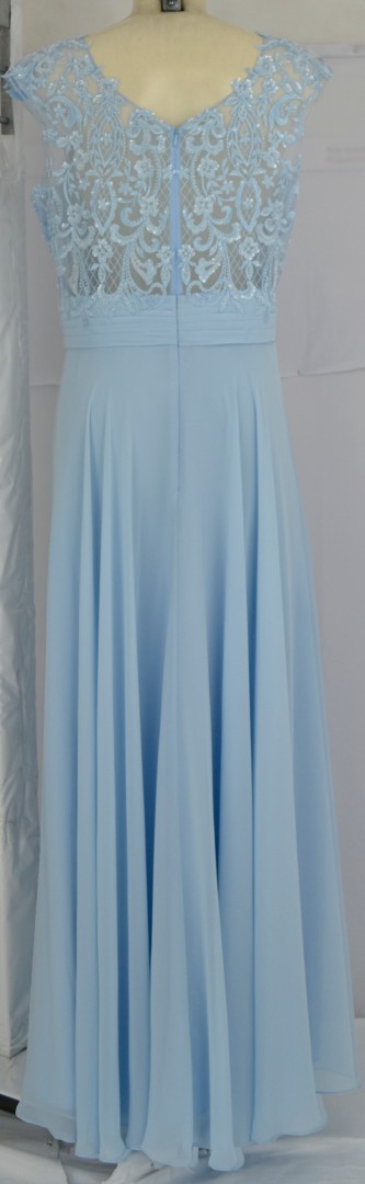 Das festliche lange Ballkleid wurde in hell blau designt. Das mit leicht transparentem Einsatz sowie viel Spize und Perlen versehene leicht glänzende Bustier mit V-Ausschnitt verleiht diesem Kleid einen besonderen Charme. Auch der in Falten gelegte Rockteil mit Schluppe macht das Modell zum echten Highlight