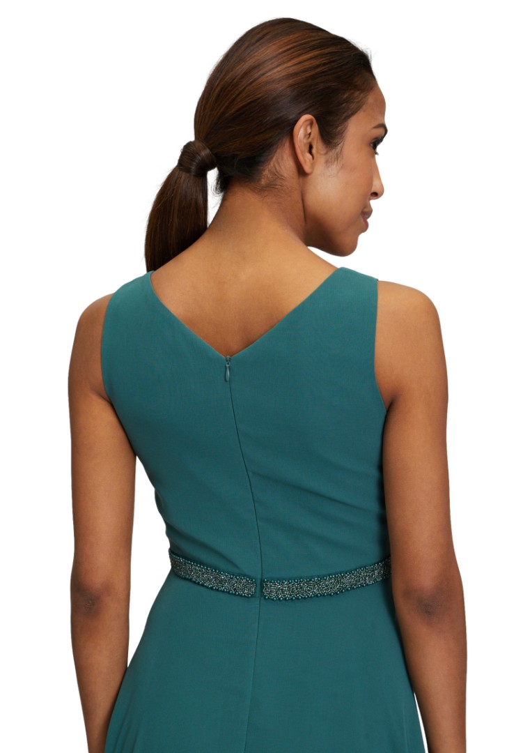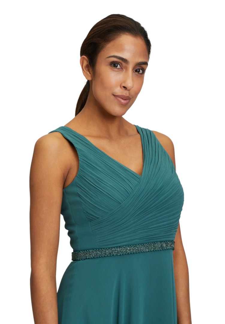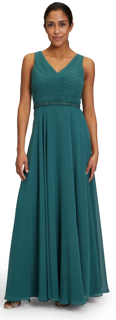 Bei diesem festlichen Kleid wurde das Oberteil mit V-Ausschnitt in Falten gelegt. Auch das mit edlem Schmuck versehene Taillenband sowie der leicht ausgestellte Rockteil machen das Modell in dark emerald zum echten Hingucker