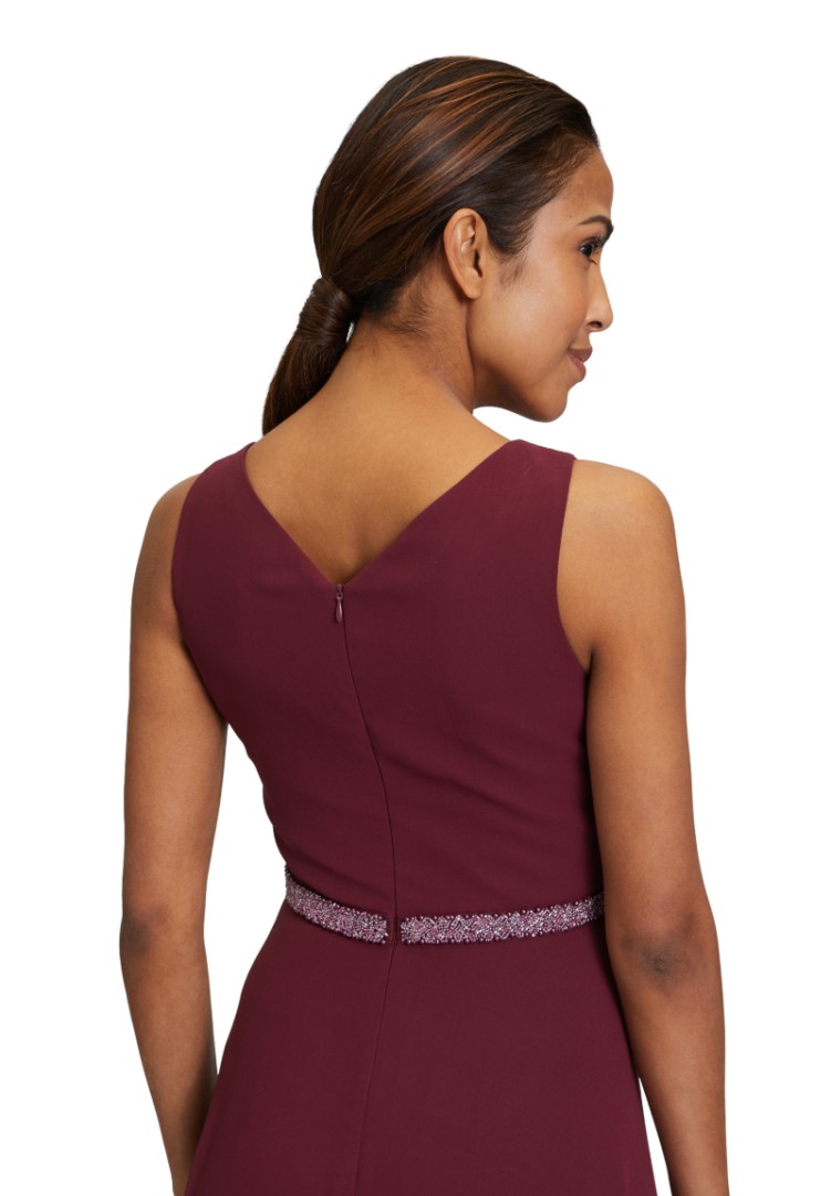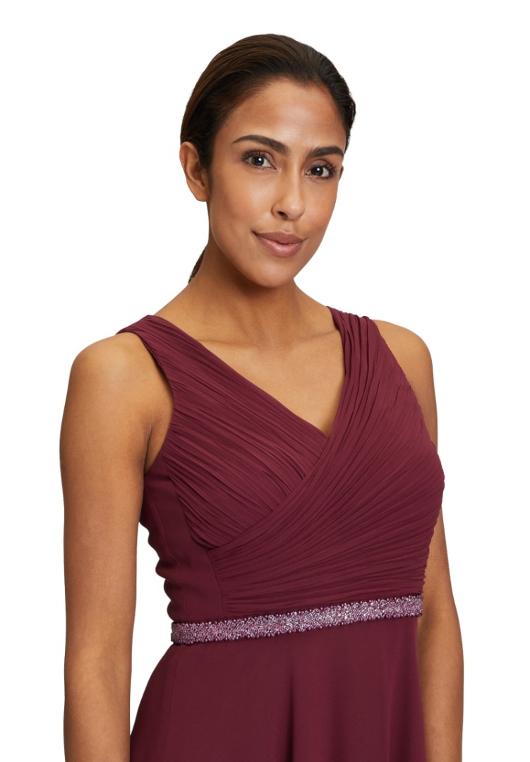 Bei diesem festlichen Kleid wurde das Oberteil mit V-Ausschnitt in Falten gelegt. Auch das mit edlem Schmuck versehene Taillenband sowie der leicht ausgestellte Rockteil machen das Modell in deep wine zum echten Hingucker