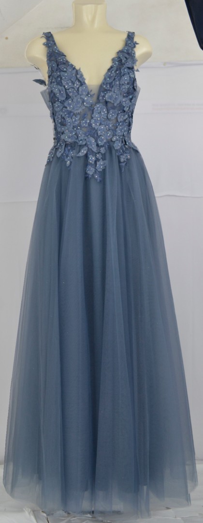 Dieses wunderschöne Abendkleid wurde in iron blue designt. Das mit gepolsterten Cups und V-Ausschnitt sowie feinen Perlen versehene Bustier ist hier ein echter Hingucker mit 3D Blumen aus Mesh. Auch der in Falten gelegte Rockteil in A-Form aus Mesh verleiht diesem Kleid einen besonderen Charme