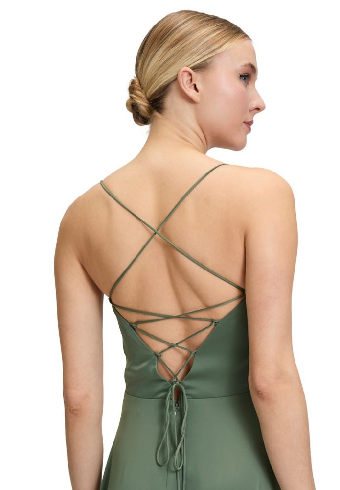 Das figurumspielende maxi lange Ballkleid ohne Arm sowie langem Schlitz vorne wurde mit Wasserfallausschnitt in light aventurine designt. Aus leicht fließendem Satin mit dezentem Glanz ist das Modell mit Schnürung und R-V im Rücken einfach perfekt für Ihren besonderen Anlass