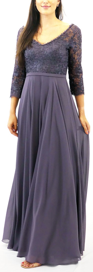 Das festliche Ballkleid wurde in grau-violett designt. Das leicht glänzende Oberteil mit V-Ausschnitt wurde mit 3/4 langem Arm sowie viel Spitze und dezentem Glanz gefertigt. Auch der in Falten gelegte Rockteil macht dieses Kleid einfach perfekt für die besonderen Anlässe
