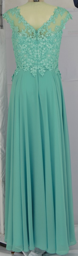 Das lange Ballkleid bei dem das Oberteil mit viel Spitze und feinen Perlen versehen wurde ist einfach perfekt für Ihren festlichen Auftritt. Mit V-Ausschnitt und leicht schwingendem sowie in Falten gelegtem Rockteil wurde das Modell in mint designt