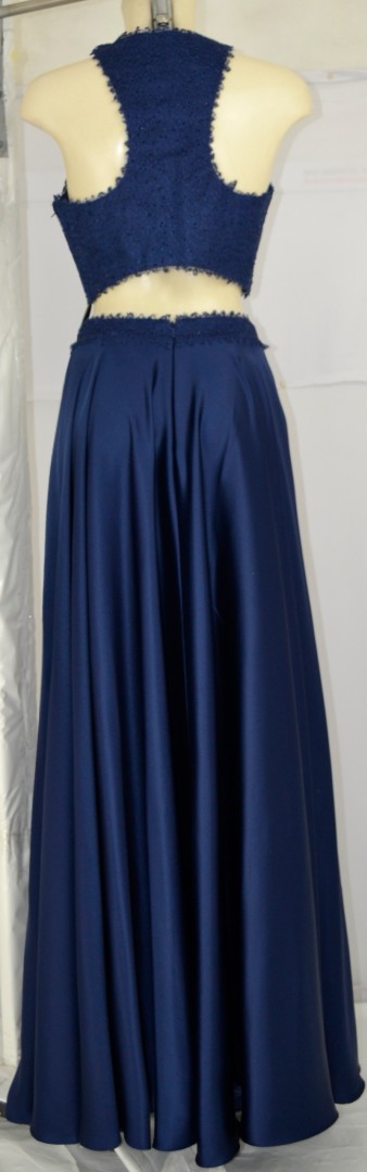 Dieses romantische Ballkleid in mitternachtsblau wurde als 2-Teiler designt. Das Oberteil wurde hier mit rundem Ausschnitt sowie edlen Pailletten und Spitze versehen. Auch der leicht glänzende Rockteil verleiht diesem Kleid etwas besonderes