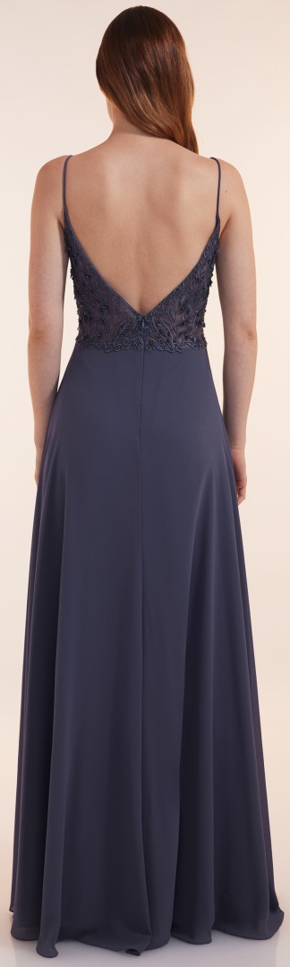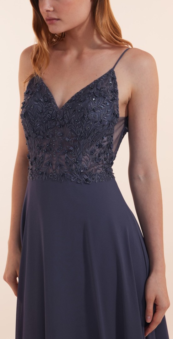 Das lange Ballkleid wurde in nightshadow blue designt. Das leicht transparente Bustier mit V-Ausschnitt wurde hier floral mit Spitze und Perlen fein besetzt. Auch der leicht ausgestelle Rockteil verleiht diesem Modell das gewisse etwas