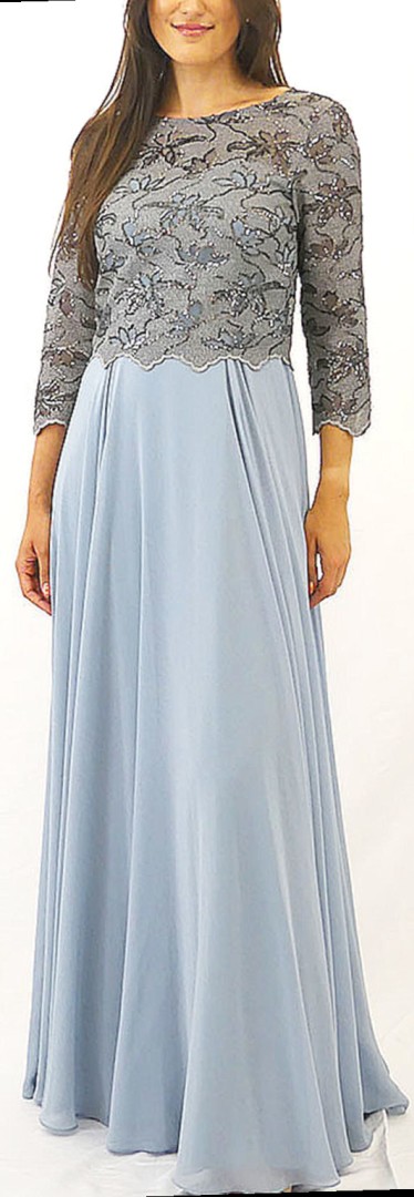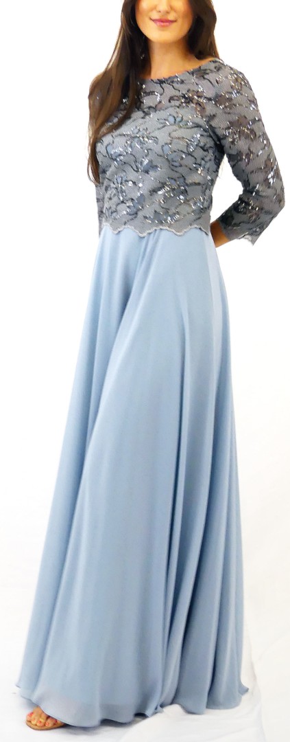 Das festliche Ballkleid wurde in rauch-blau designt. Das leicht glänzende Oberteil mit rundem Ausschnitt wurde mit 3/4 langem Arm sowie dezentem Glanz gefertigt. Auch der in Falten gelegte Rockteil macht dieses Kleid einfach perfekt für Ihren besonderen Anlass