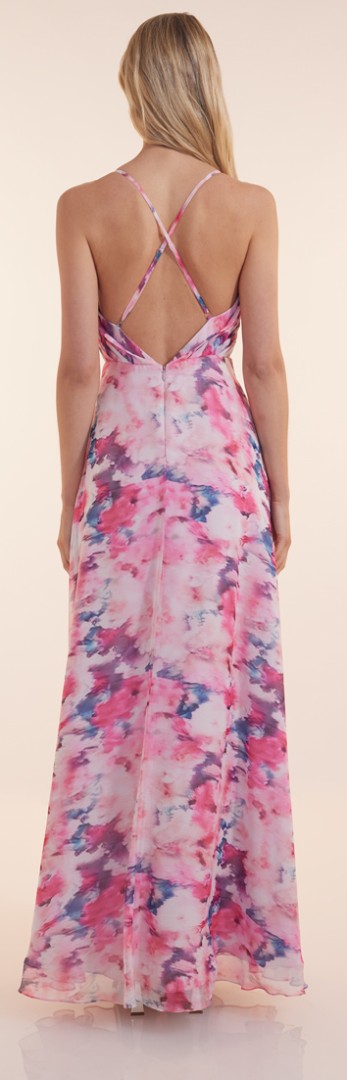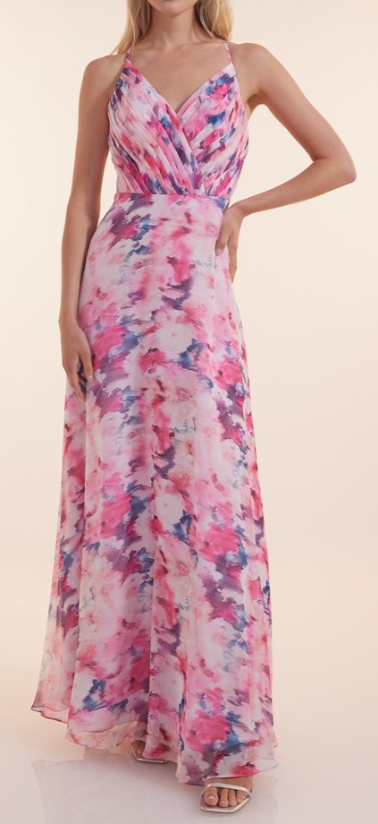 Das maxi lange Kleid ist ein echter Hingucker. Leicht ausgestellt sowie mit gerafftem Bustier und dem Rückenteil mit V-Ausschnitt lässt sich dieses Modell in rose-print mit dezentem Glanz auch zu den besonderen Anlässen tragen