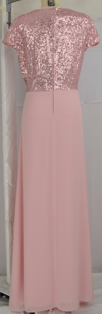 Bei diesem eleganten Ballkleid wurde das Oberteil mit V-Ausschnitt sowie überschnittenem Arm allover mit Pailletten versehen. Auch der gerade geschnittene Rockteil in rose verleiht diesem Modell einen besonderen Charme