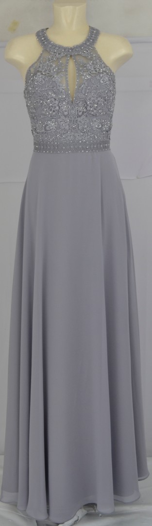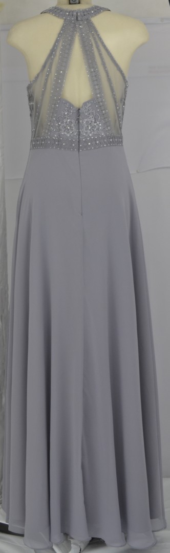 Das maxi lange Ballkleid in silver-grey wurde mit romantischem Neckholder designt. Das mit gepolsterten Cups sowie leicht transparenten Einsätzen versehene Bustier wurde hier mit feinen Perlen und viel Spitze versehen