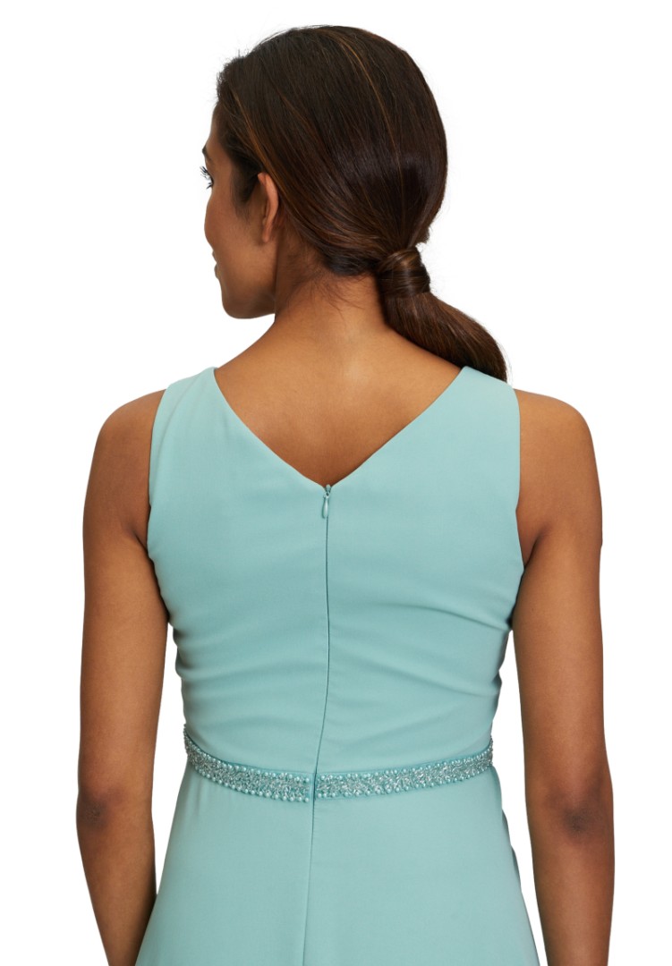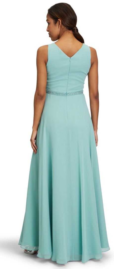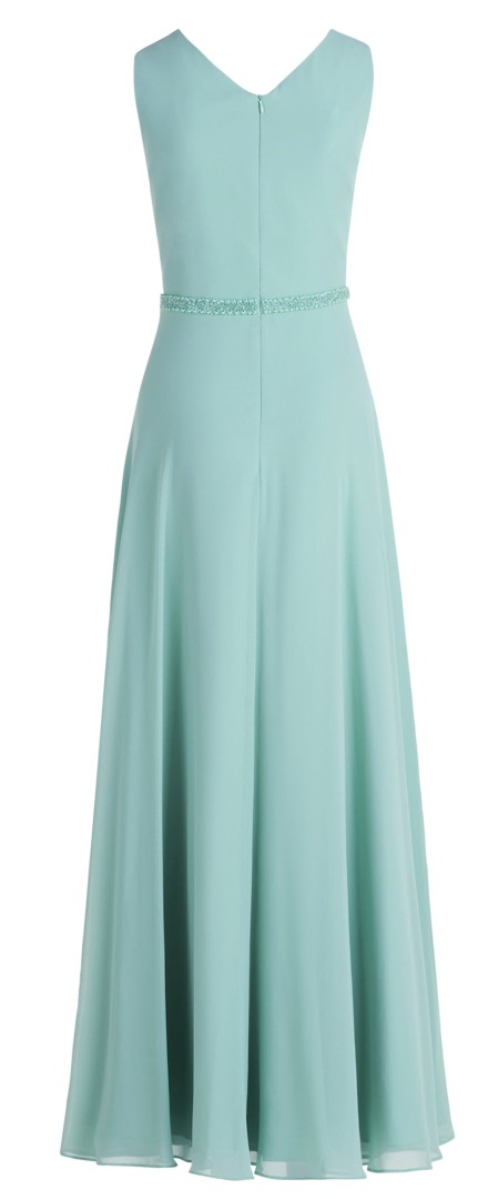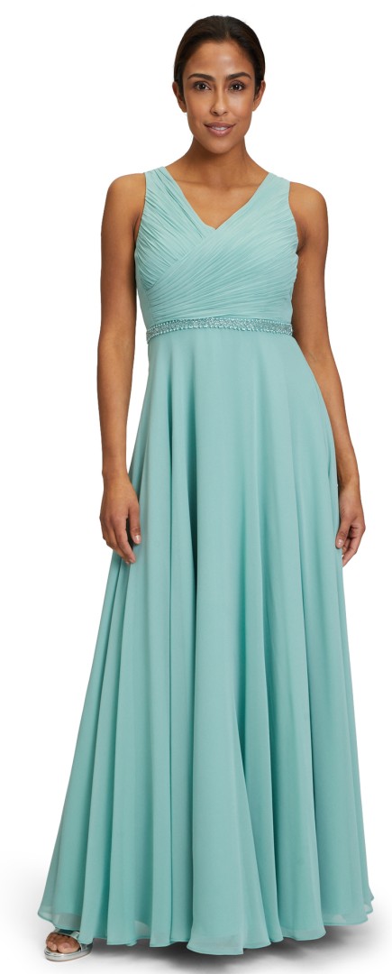 Bei diesem festlichen Kleid wurde das Oberteil mit V-Ausschnitt in Falten gelegt. Auch das mit edlem Schmuck versehene Taillenband sowie der leicht ausgestellte Rockteil machen das Modell in strong mint emerald zum echten Hingucker