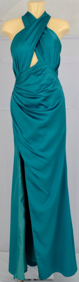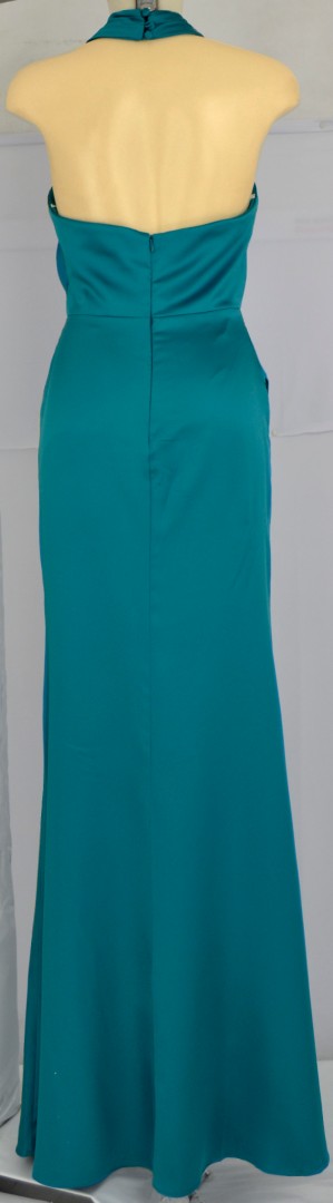 In teal als maxi langes Kleid wurde dieses Modell designt. In höhe der Taille gerafft sowie mit Neckholder und dem langen Schlitz vorne rechts im Rockteil, werden Sie mit diesem Abendkleid ganz gewiss im Mittelpunkt stehen