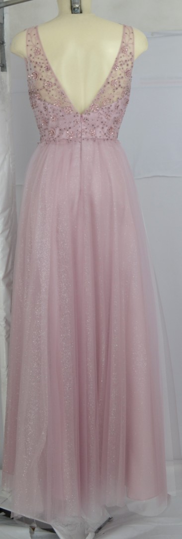 In vintage rose wurde das maxi lange Ballkleid designt. Auch dieses Bustier wurde mit viel Pailletten und Spitze versehen. Auch der ausschwingende Rockteil mit glänzendem Mesh macht das Kleid zum echten Highlight