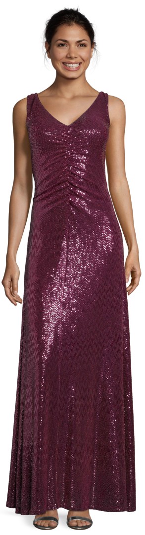 Das traumhafte lange Abendkleid besticht durch seinen festlichen Glanz. Ohne Arm sowie mit der romantischen Raffung unter dem V-Ausschnitt gehört dieses leicht ausgestellt Modell in dark-red-black zu den Highlights der Saison
