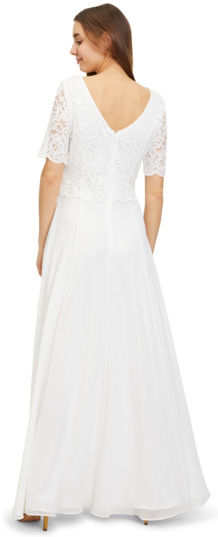 Dieses Brautkleid mit 1/2 Arm von Vera Mont ist ein echter Hingucker. Mit viel Spitze am Oberteil sowie rundem Ausschnitt und dem schwingenden Rockteil aus feinen Chiffon ist dieses maxi lange Modell für Ihre Trauung ein echter Hingucker