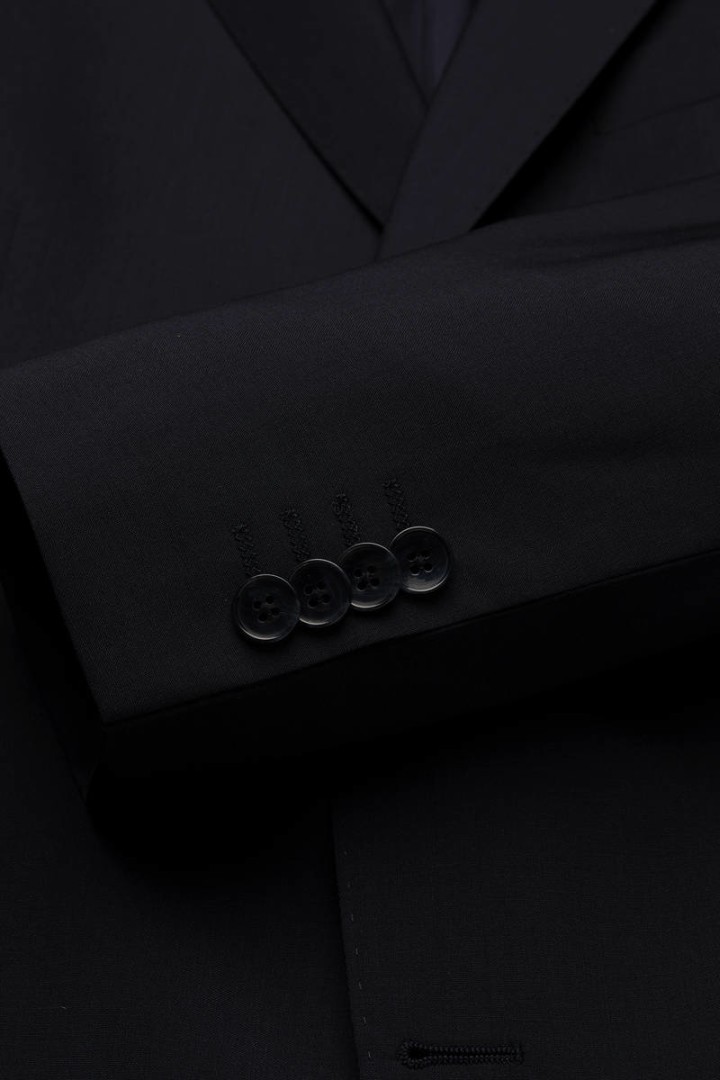 - Gerade geschnittener Einreiher mit zwei Knöpfen, Revers des Sakkos mit Kopfloch, Brusttasche