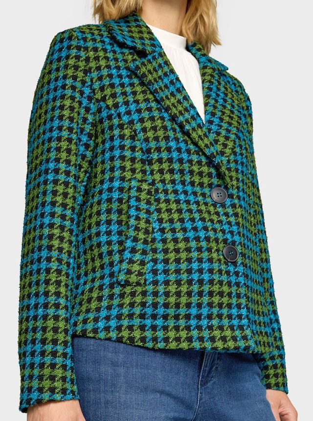 Diese top aktuelle Jacke mit leicht verkürzter Länge wurde in petrol-grün fein kariert als 2 -Knopf Variante mit Revers-Kragen und seitlichen Taschen designt. Einfach perfekt für diverse Anlässe