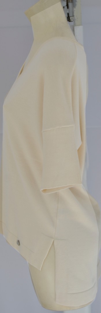 Dieser sommerlich leichte Pullover in cream wurde mit V-Ausschnitt designt. Vorne ca. 12 cm kürzer sowie mit 9 cm Schlitz im Abschluss gehört dieses Modell zu den Hightlights der Saison