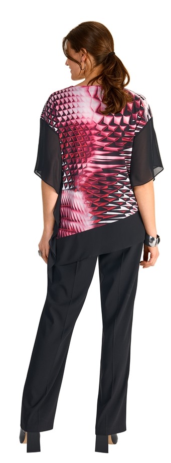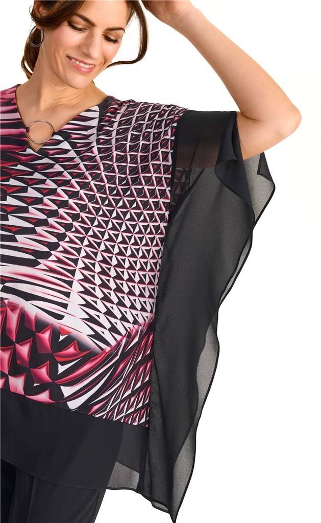 Dieses elegante Longshirt lässt sich auch zu den besonderen Anlässen prima kombinieren. In mehrfarbig gemustert mit rot-schwarz sowie mit V-Ausschnitt mit Schmuckstange ist das Modell ein echter Hingucker in diagonaler Schnittführung und Fledermaus Arm