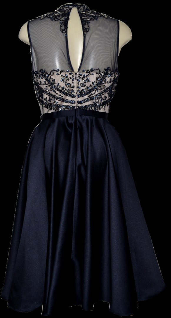 Dieses traumhaft schöne Ballkleid wurde in midi Länge also leicht verkürzt in deep blue designt. Bei diesem Modell wurde das hochgeschlossene Oberteil bis hin zur Taille mit romantischen Pailletten und Schmuck versehen. Auch die transparente Rücken Optik sowie der leicht schwingende Rockteil machen dieses Kleid zum echten Hingucker