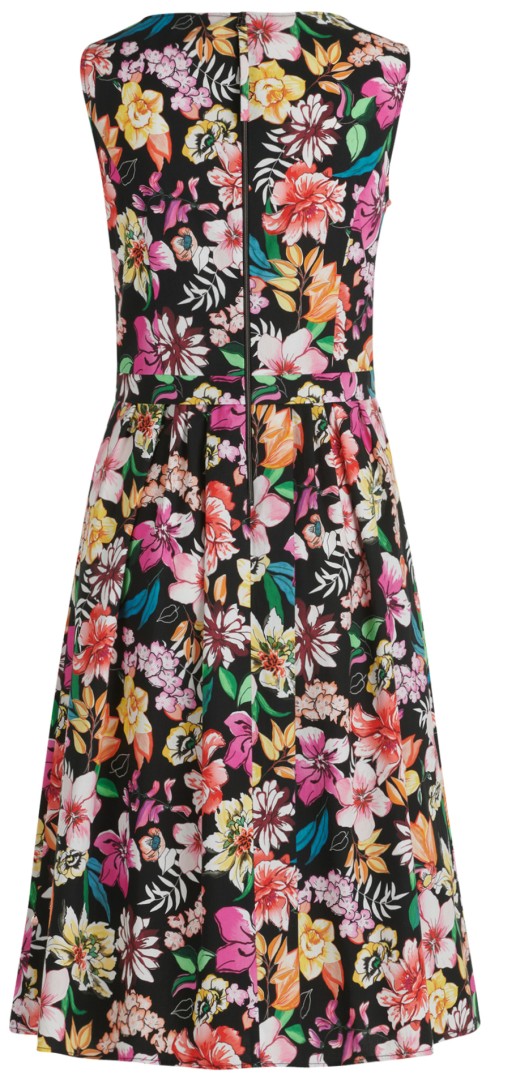 Dieses leichte midi lange Sommererkleid wurde allover geblümt in schwarz-pink mit rundem  Ausschnitt designt. Unter der Taille in romantische Falten gelegt lässt sich dieses knieumspielende Modell mit seitlichen Taschen sowie ohne Arm aus einer edlen Baumwoll Mischung auch zu den besonderen Anlässen tragen