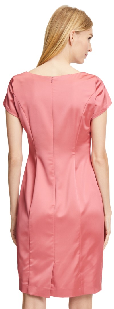Dieses mittellange Etuikleid wurde in lipstick pink designt. Die romantische Faltenlegung unter dem runden Ausschnitt machen das knieumspielende Modell zum echten Allrounder in Stretch-Satin Qualtität