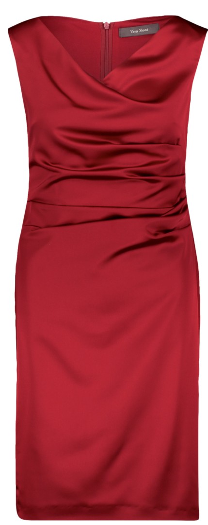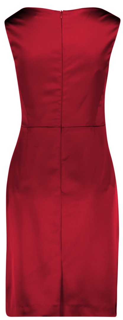 Dieses mittellange Etuikleid wurde in ruby red designt und kann nicht nur zu den besonderen Anlässen getragen werden. In edler stretch-satin Qualtität macht dieses Modell mit V-Ausschnitt auch durch die modischen Raffungen in Höhe der Taille immer eine gute Figur