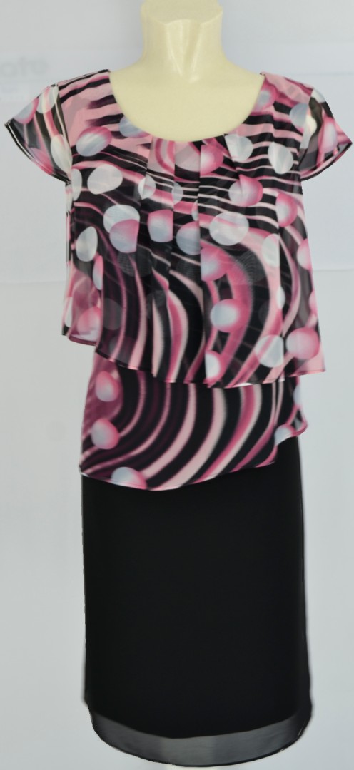 Dieses top aktuelle mittellange Kleid wurde im Blouson Style designd. Mit dem Rockteil in schwarz sowie dem Oberteil in Lagen-Optik sowie in rose-schwarz-ecru gemustert ist dieses Modell ein echter Hingucker auch für die besonderen Anlässe