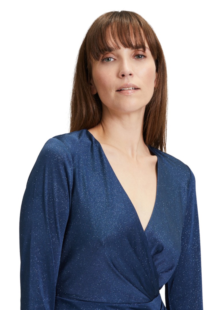 Dieses edle Kleid in mittlerer Länge (Knieumspielend) wurde in silky blue designt. Der feine Glanz  macht dieses Modell von V by Vera Mont aus Edeljersey mit V-Ausschnitt und 1/1 langem Arm zum echten Hingucker