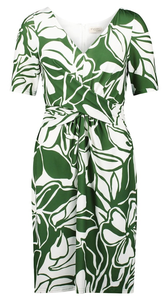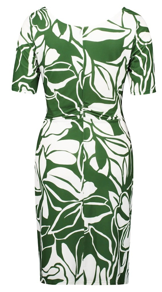 Dieses knieumspielende Kleid mit V-Ausschnitt sowie 1/2 Arm wurde in green-nature mit Raffung in taillenhöhe designt und lässt sich nicht nur zu den besonderen Anlässen tragen