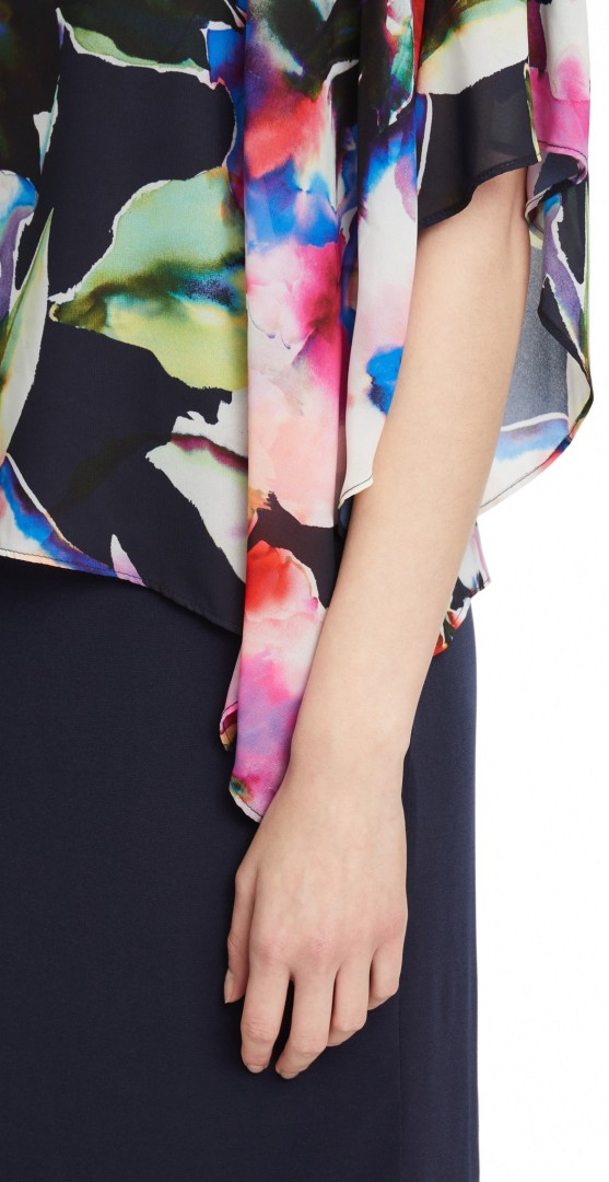 Dieses edle Chiffon Kleid in mittlerer Länge kann auch zu ganz besonderen Anlässen getragen werden. Der romantische florale Druck auf dem diagonal geschnittenem Volant macht dieses Modell in dark blue pink zum echten Highlight