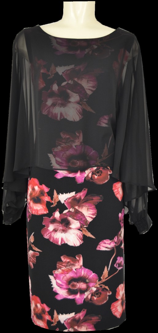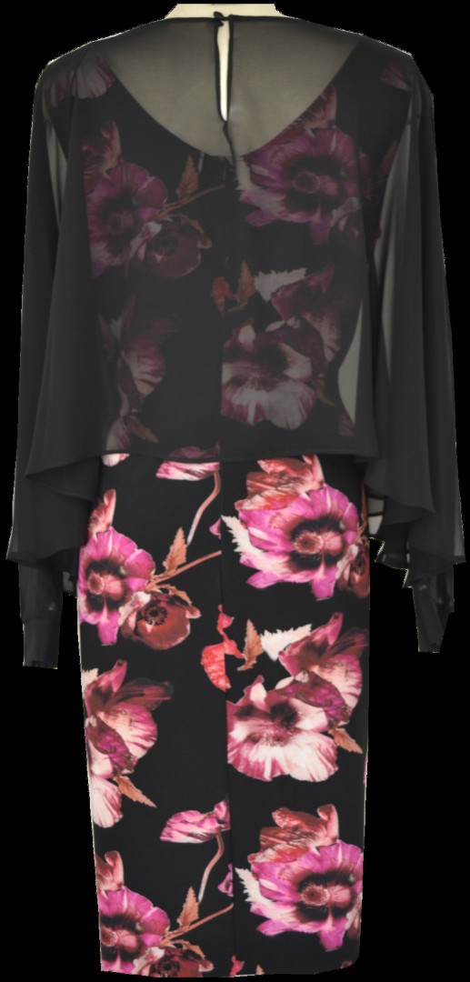 Als echten Hingucker kann man dieses mittellange Kleid auch bezeichnen. Das Etuikleid wurde hier in schwarz mit einem orientalischem floralem Druck mit rot versehen. Der angenähte und leicht transparente Chiffon Überwurf mit Fledermaus Ärmel vermittelt eine ganz besondere feminine Eleganz