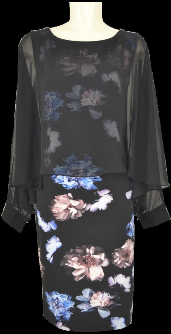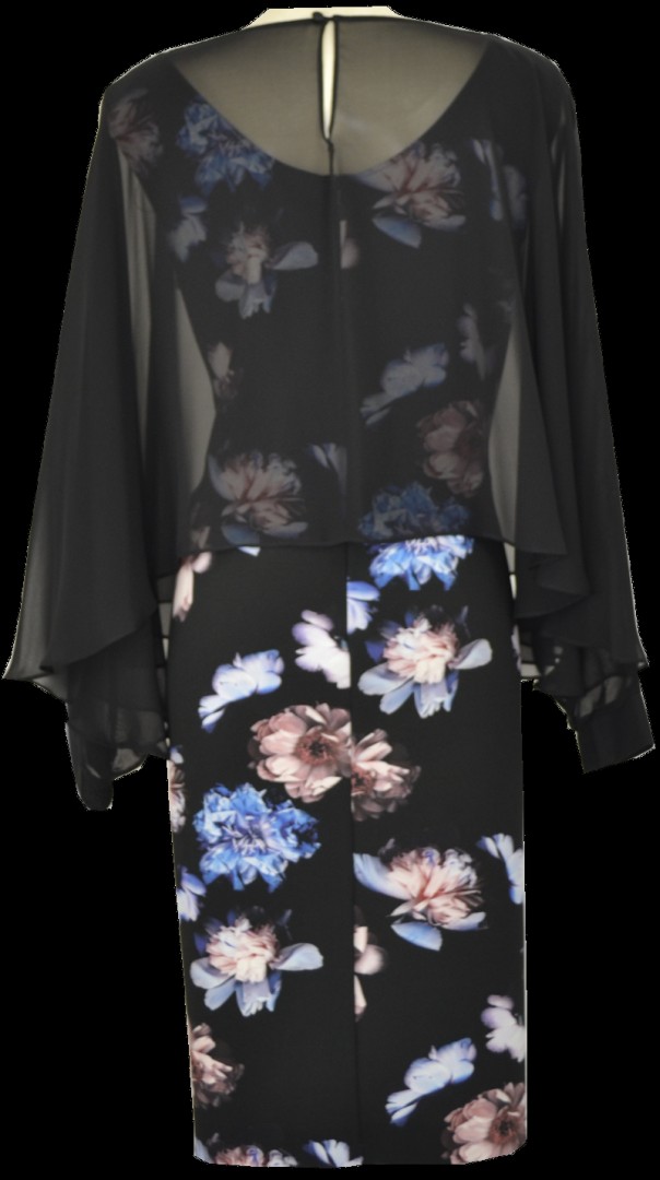 Als echten Hingucker kann man dieses mittellange Kleid auch bezeichnen. Das Etuikleid wurde hier in schwarz mit einem orientalischem floralem Druck mit blau versehen. Der angenähte und leicht transparente Chiffon Überwurf mit Fledermaus Ärmel vermittelt eine ganz besondere feminine Eleganz