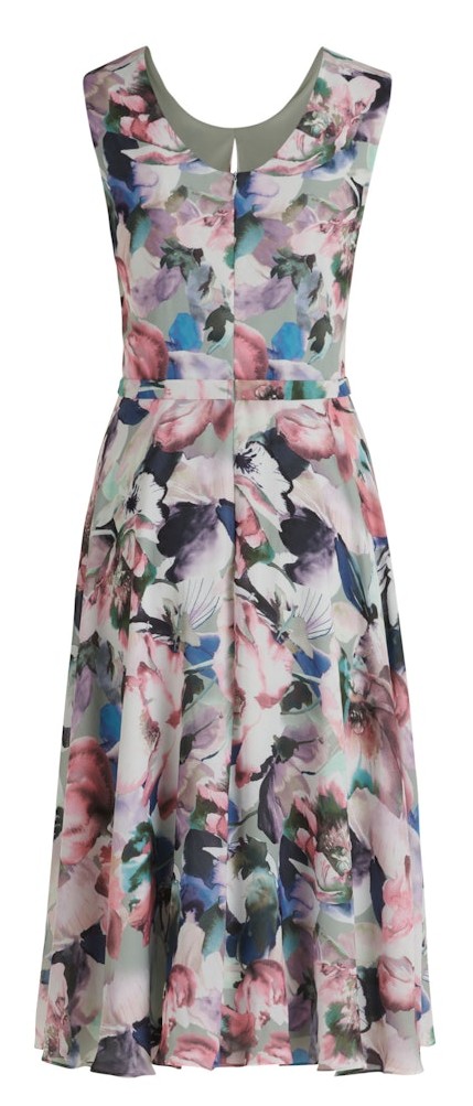 Dieses romantische Etui Kleid mit mittlerer Länge und in Falten gelegtem schwingendem Rockteil wurde in green-rosè mit floralem Dessin designt. Der runde Ausschnitt wurde hier mit einer feinen Raffung/Kräuseling versehen und verleiht diesem figurumspielende Modell einen besonderen Charme nicht nur zu den besonderen Anlässen