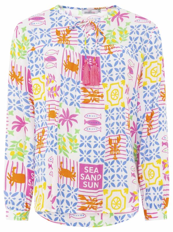 Ein romantische leicht fließende Bluse mit 1/1 Arm die mit martimem Dessin sowie Tasseln versehen wurde.