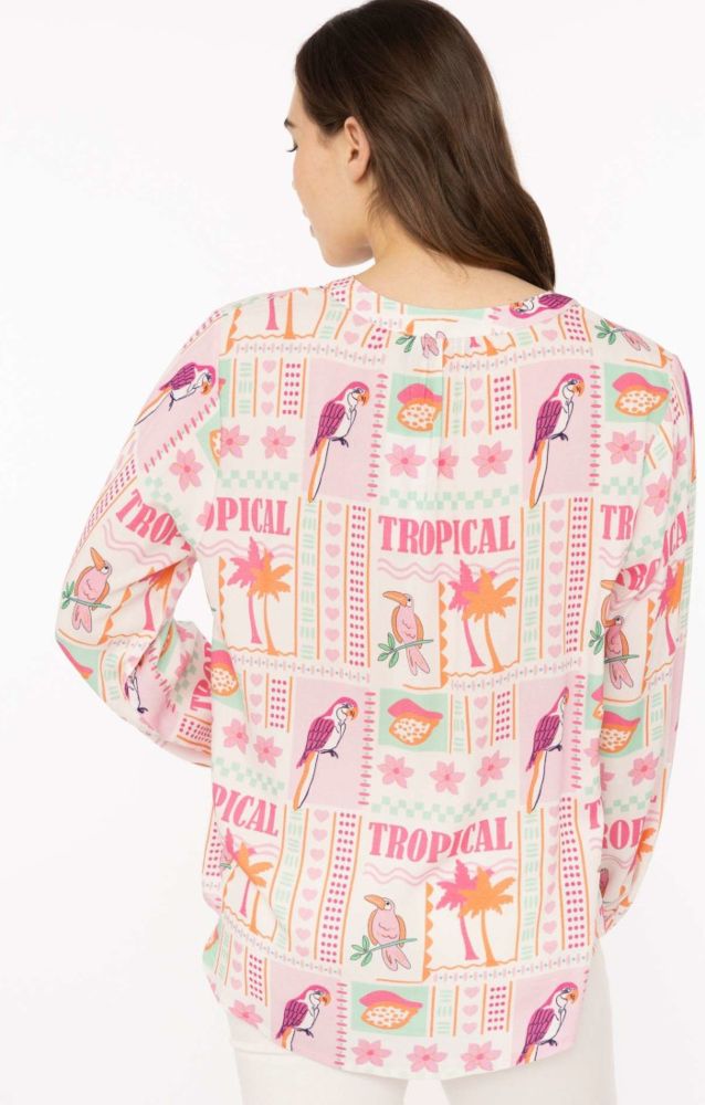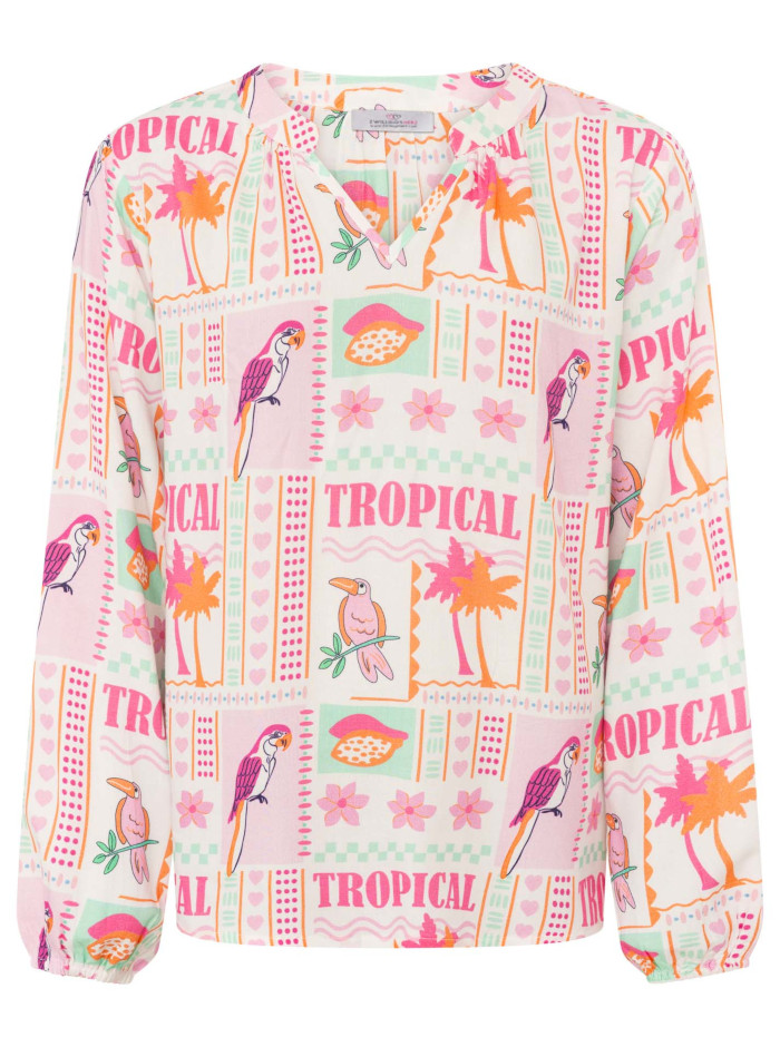 Ein romantische leicht fließende Bluse mit 1/1 Arm die mit tropischem sowie V-Ausschnitt versehen wurde.