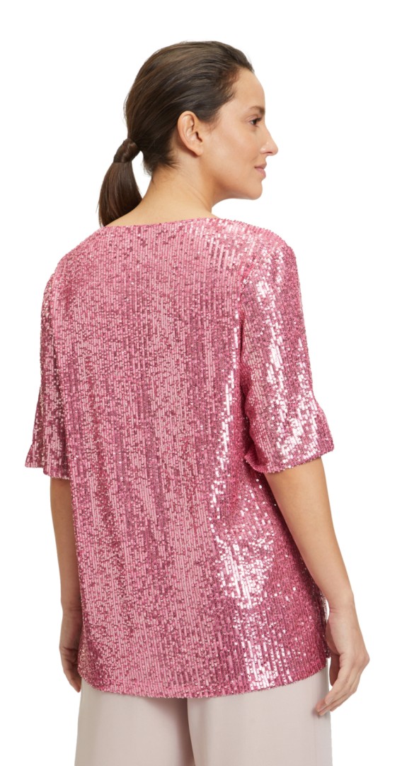 Dieses edle Shirt mit 1/2 Arm sowie V-Ausschnitt wurde allover mit Pailletten versehen und läst sich in rose-pink überaus leicht kombinieren